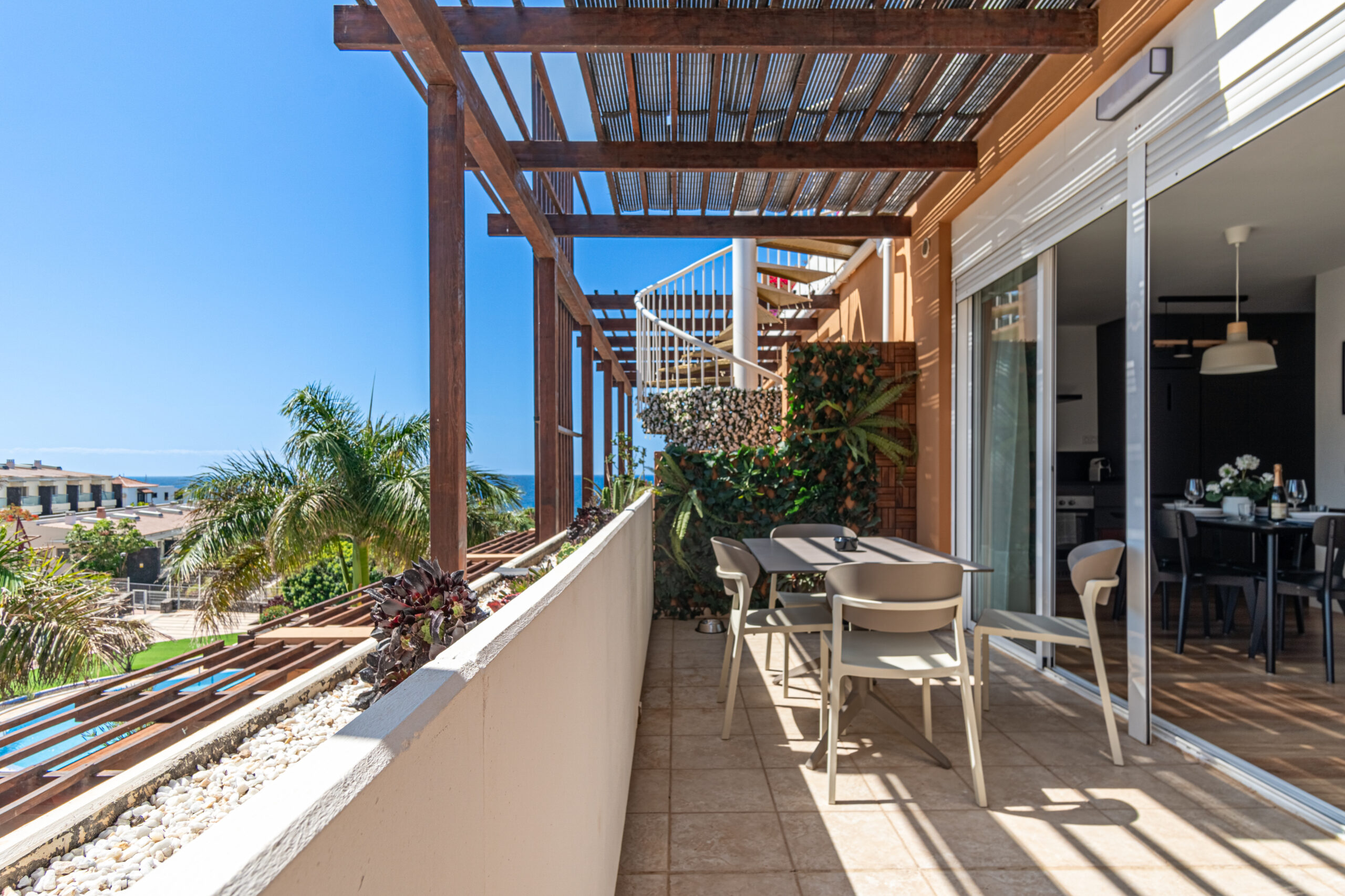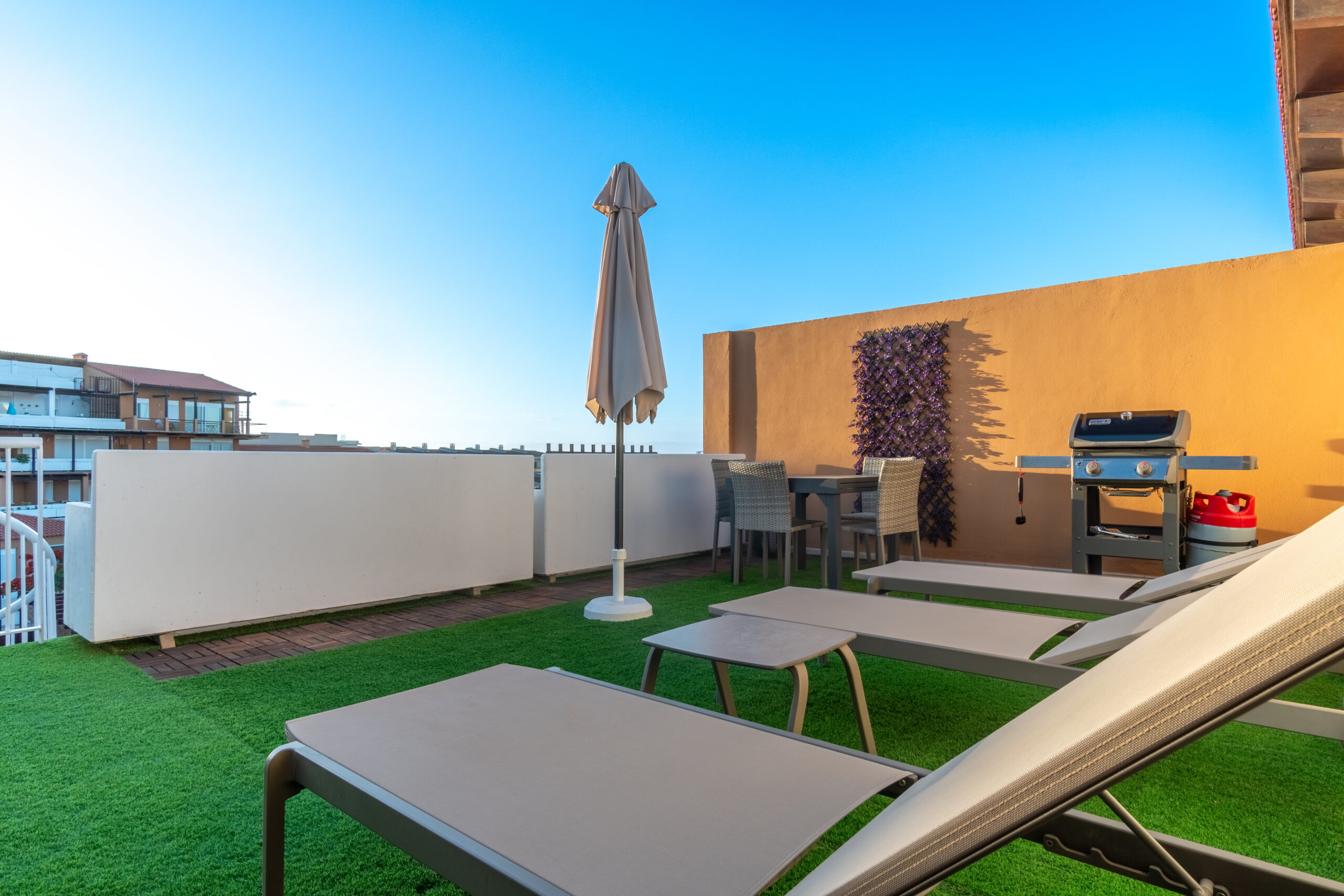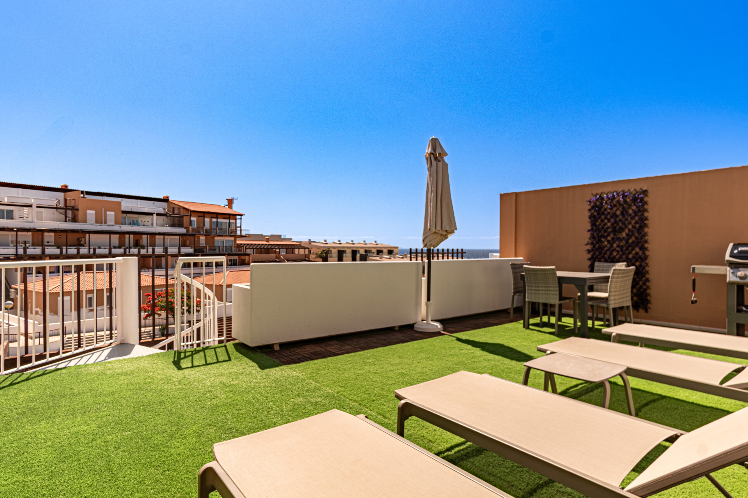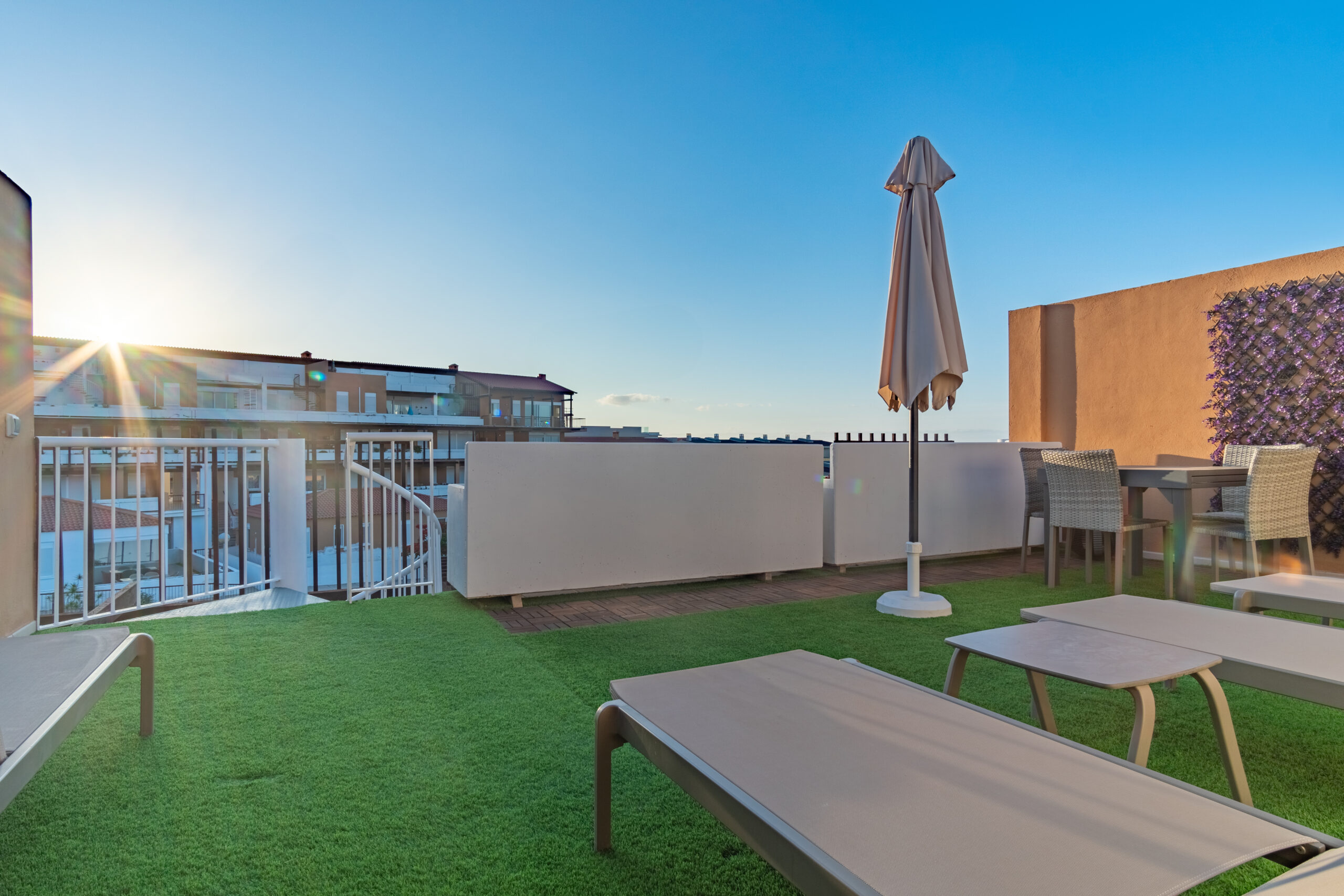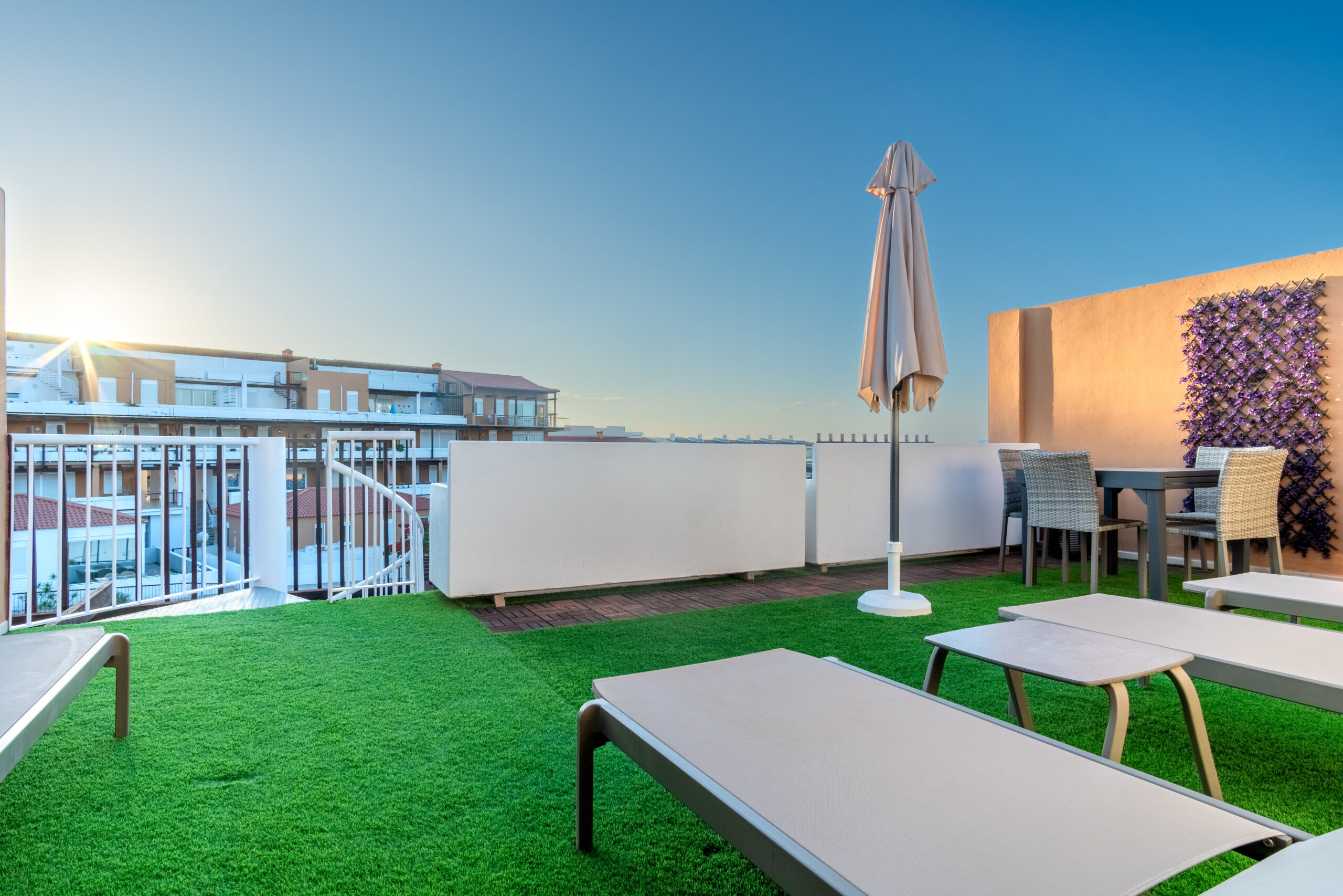 Volvemos al salón y salimos a una amplia terraza de 18 metros cuadrados donde podemos disfrutar del sol en las primeras horas del día y de la sombra asombrosa por la tarde que permite mantener la temperatura del apartamiento muy agradable sin necesidad del uso del aire acondicionado. Subimos por la escalera a caracol arriba y nos acoge una amplia terraza con vistas panoramicas de 34 metros cuadrados que sirve perfectamente como un solarium o como un espacio para reunir familia y amigas para una barbacoa.