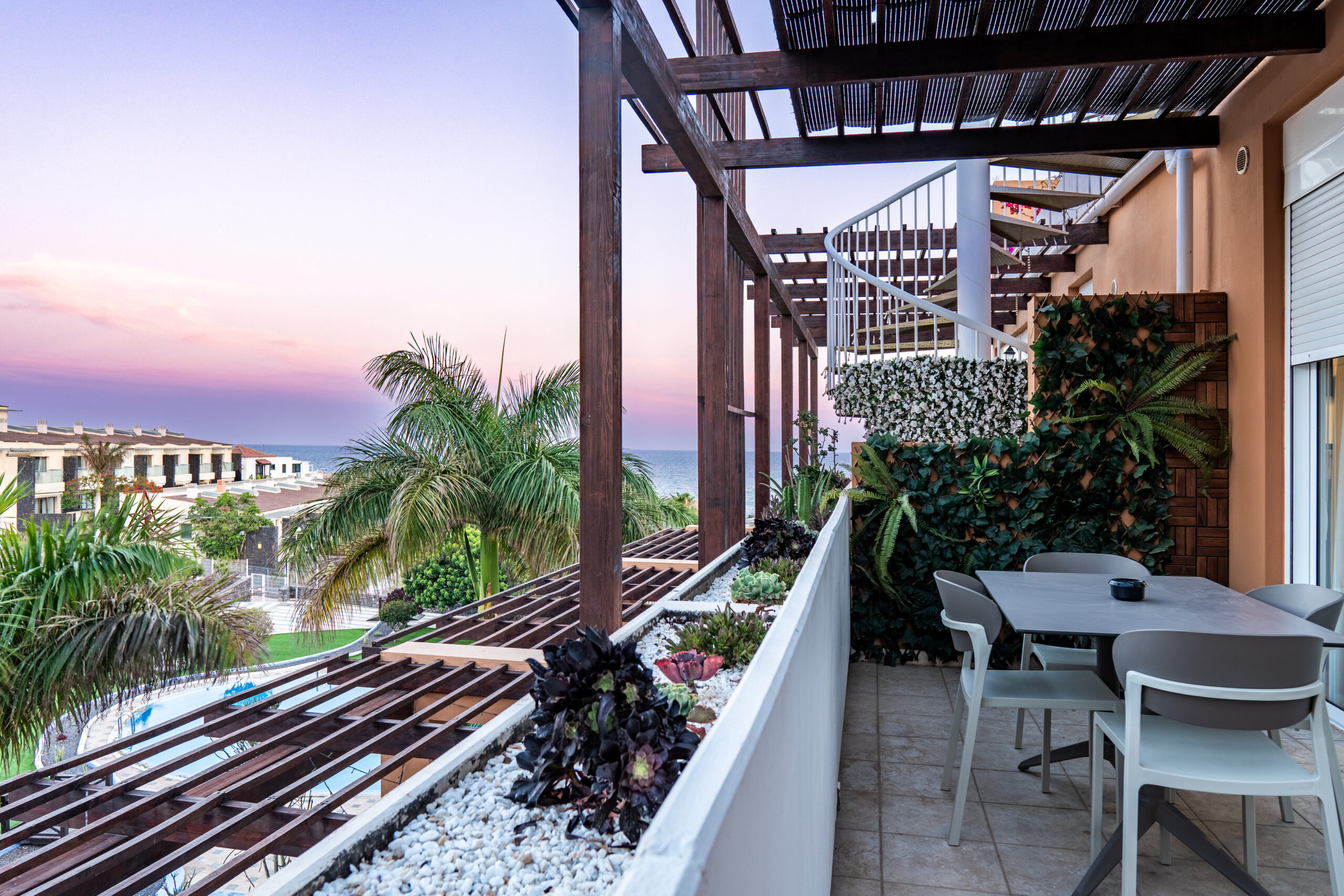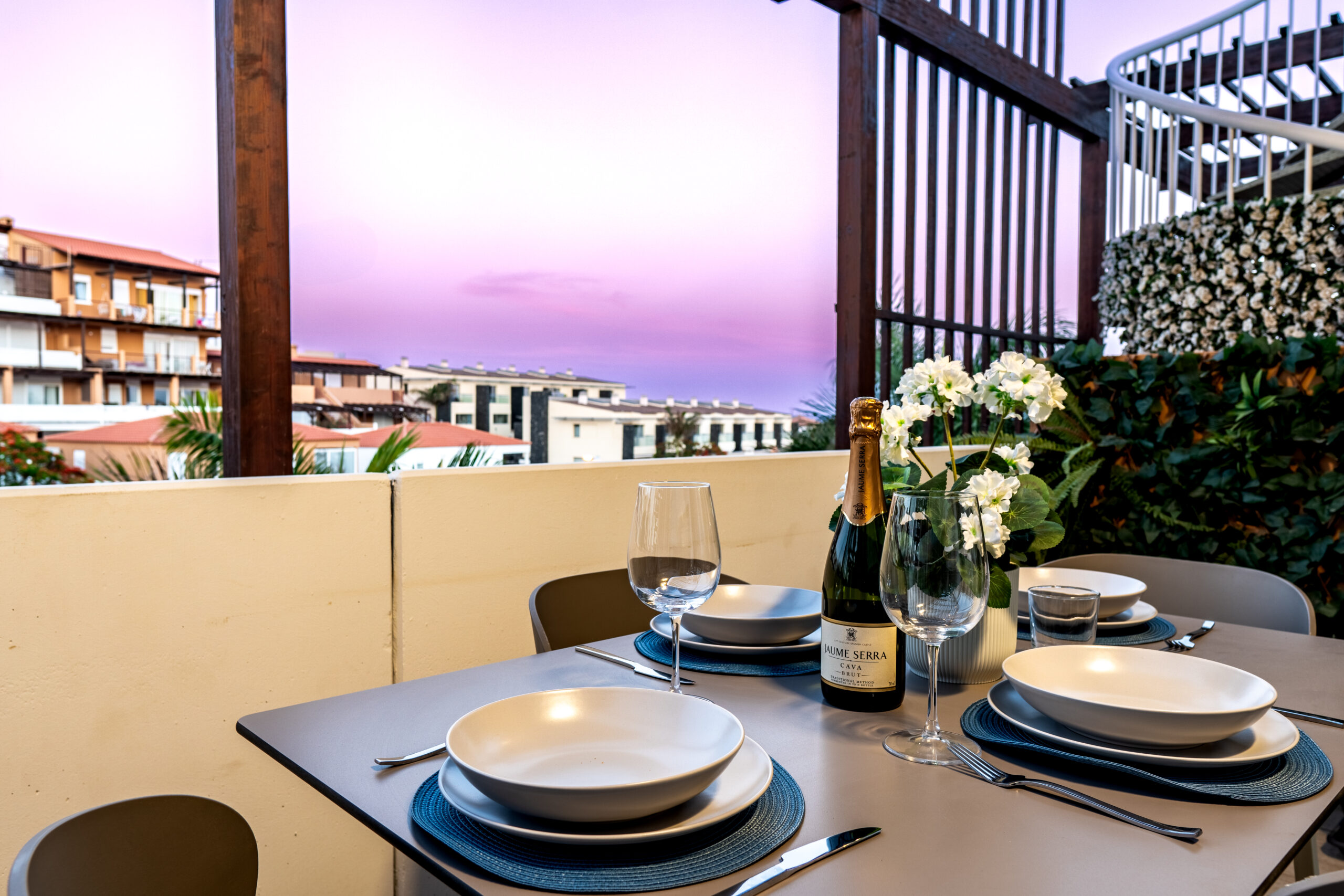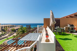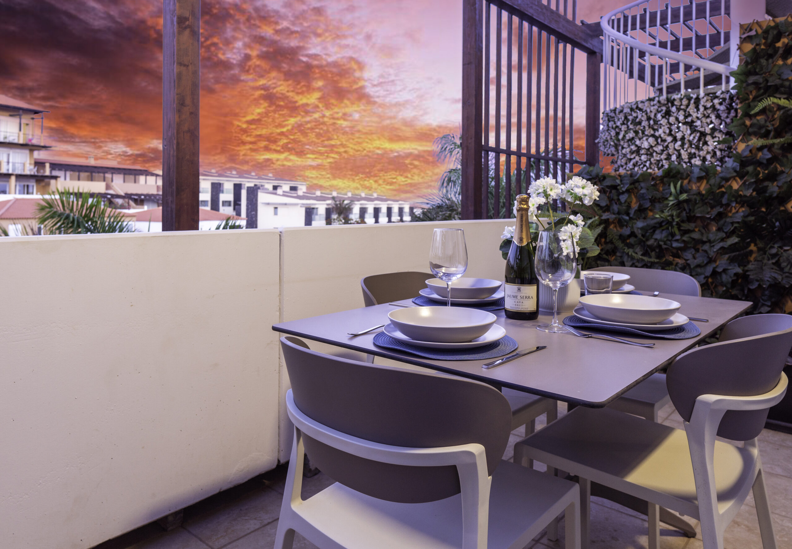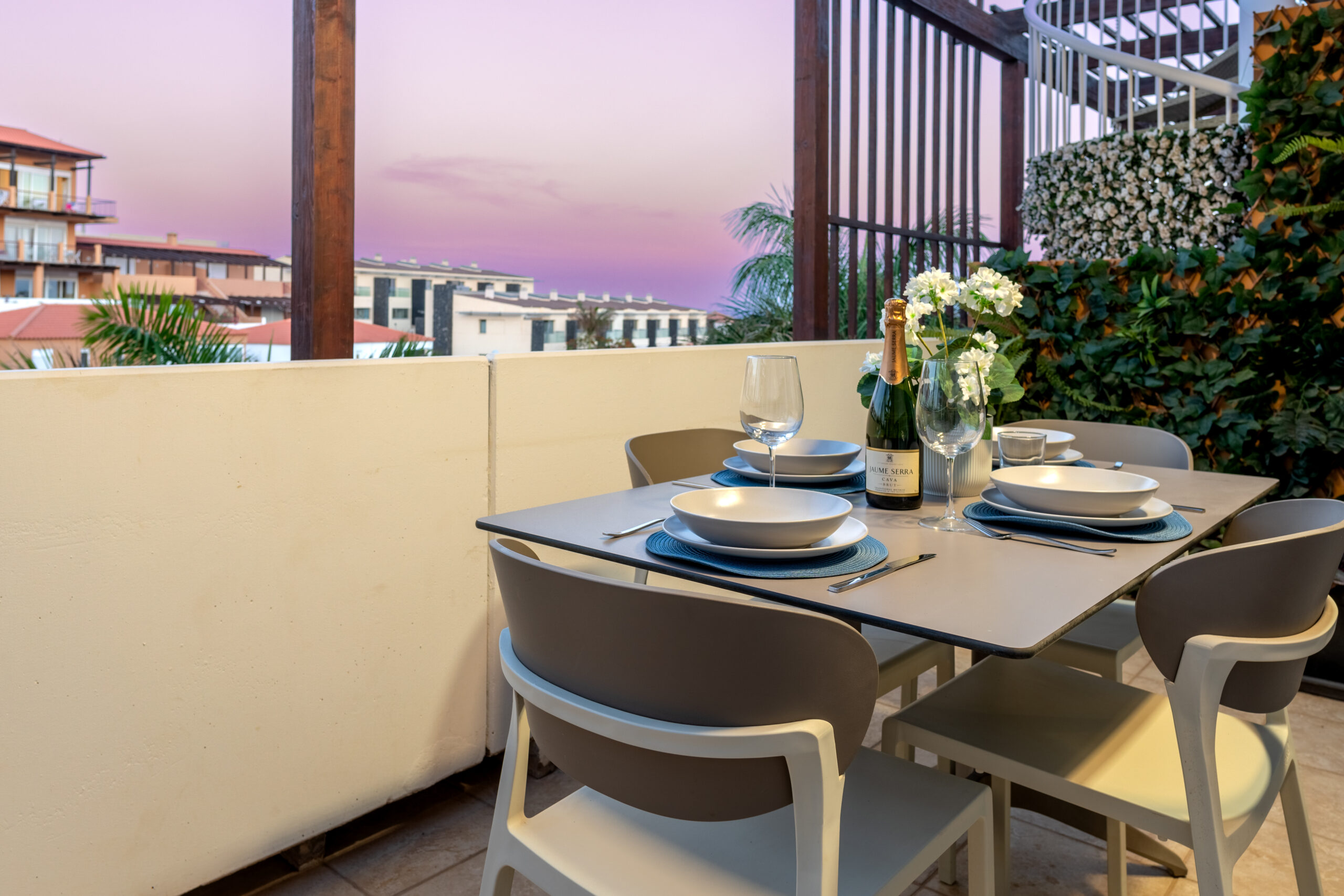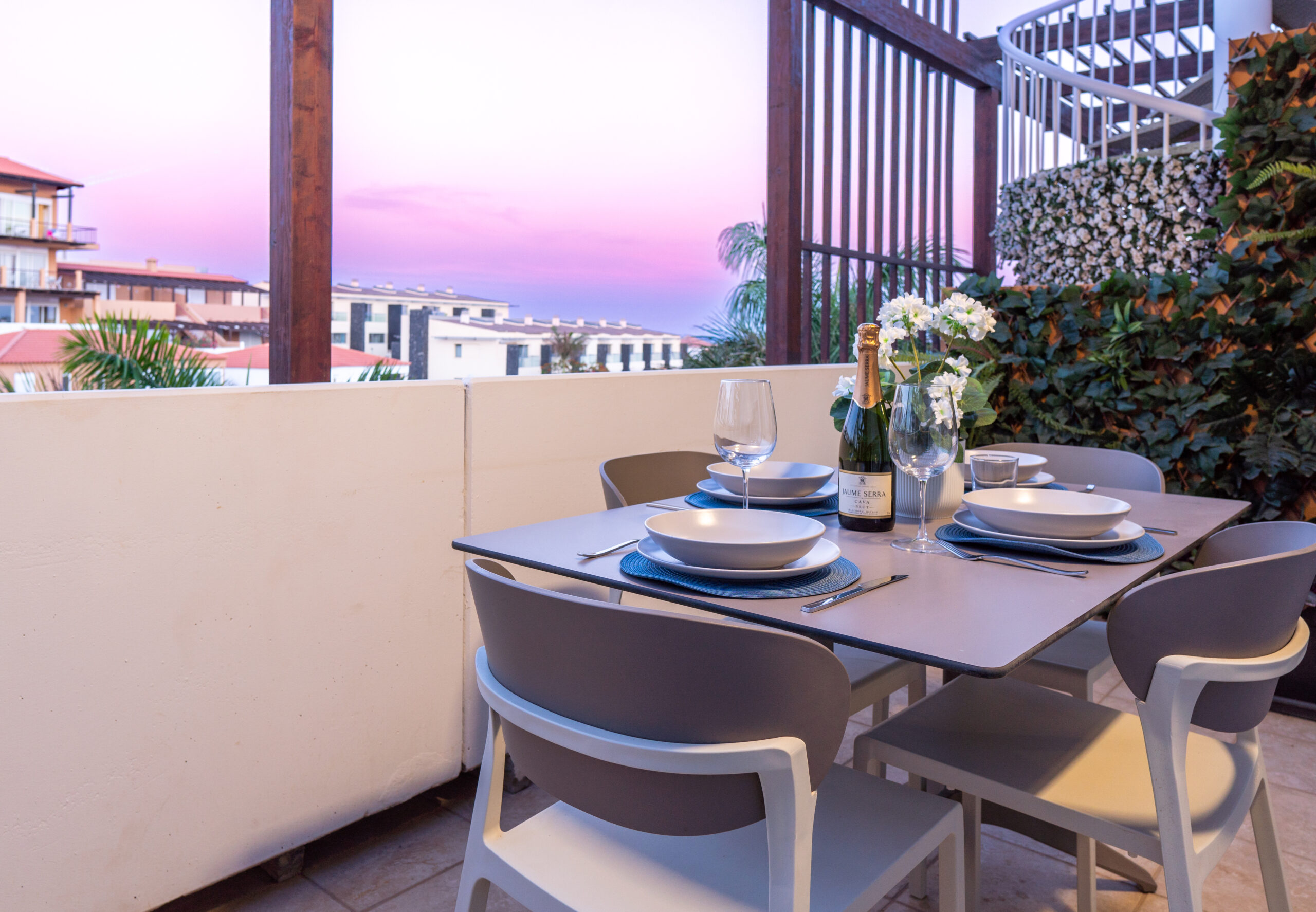 Volvemos al salón y salimos a una amplia terraza de 18 metros cuadrados donde podemos disfrutar del sol en las primeras horas del día y de la sombra asombrosa por la tarde que permite mantener la temperatura del apartamiento muy agradable sin necesidad del uso del aire acondicionado. Subimos por la escalera a caracol arriba y nos acoge una amplia terraza con vistas panoramicas de 34 metros cuadrados que sirve perfectamente como un solarium o como un espacio para reunir familia y amigas para una barbacoa.