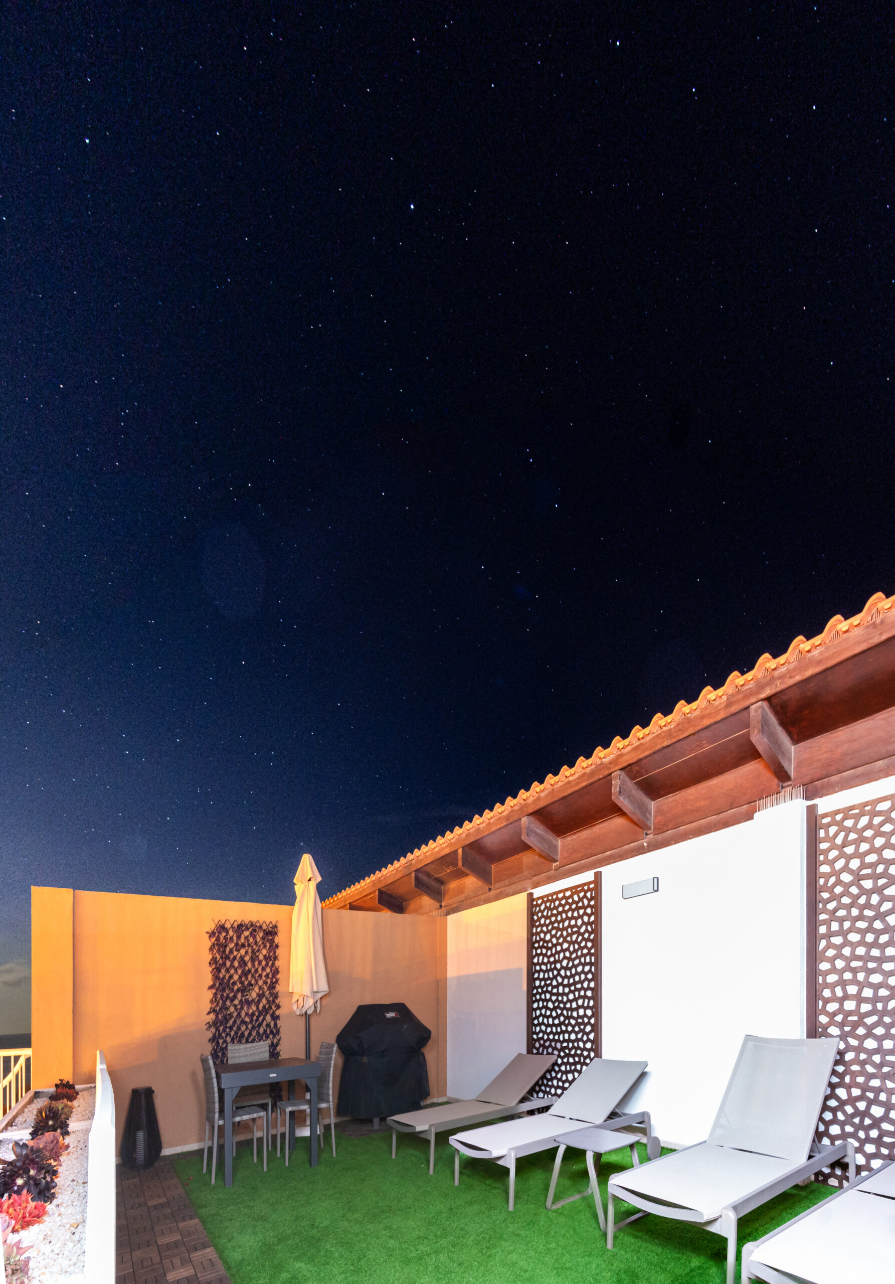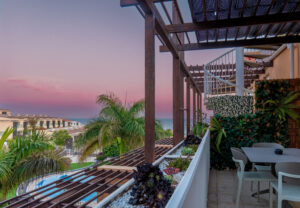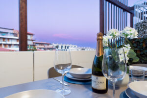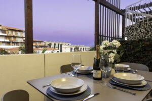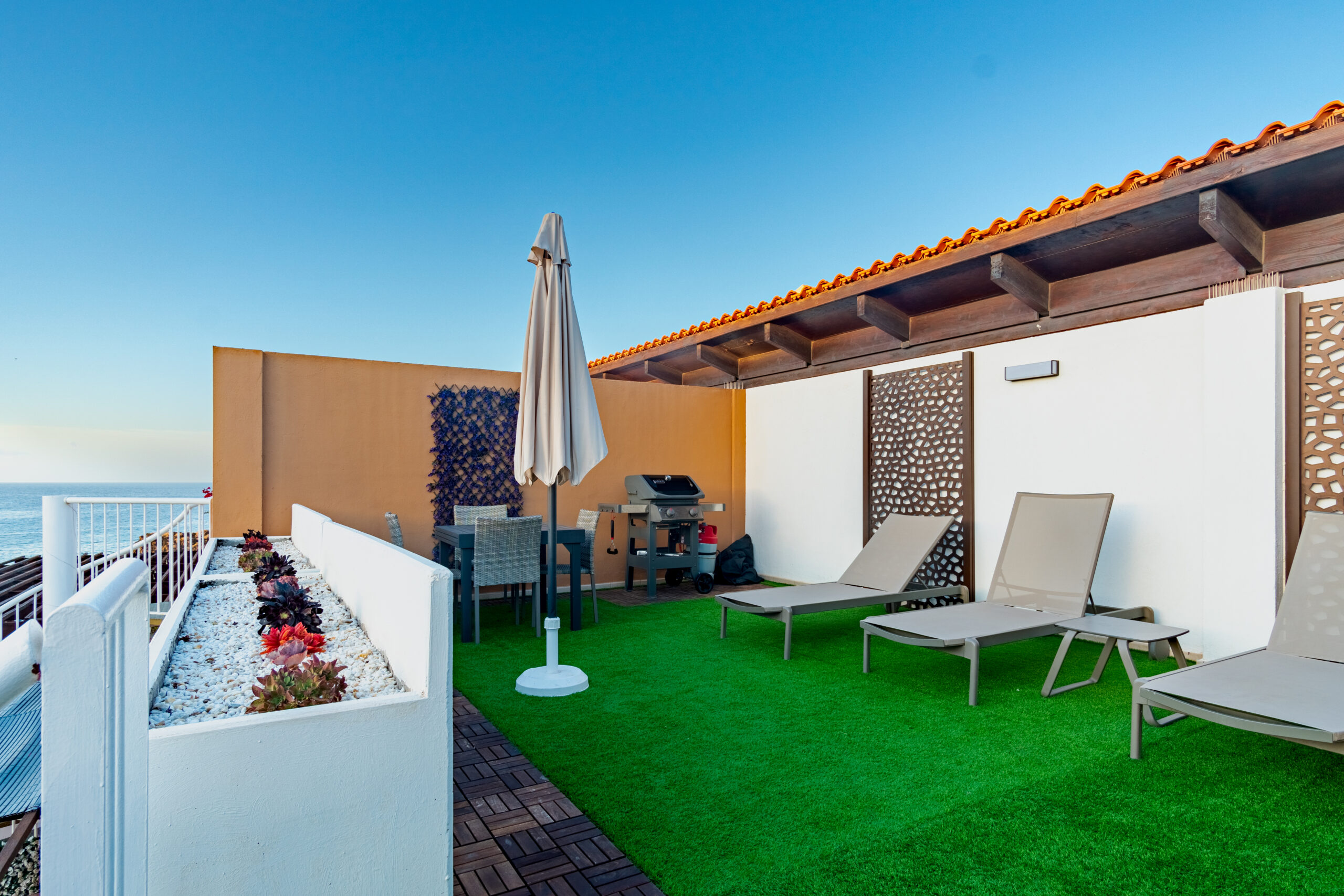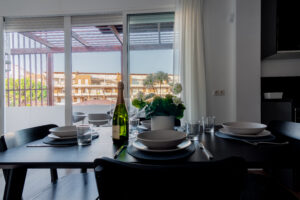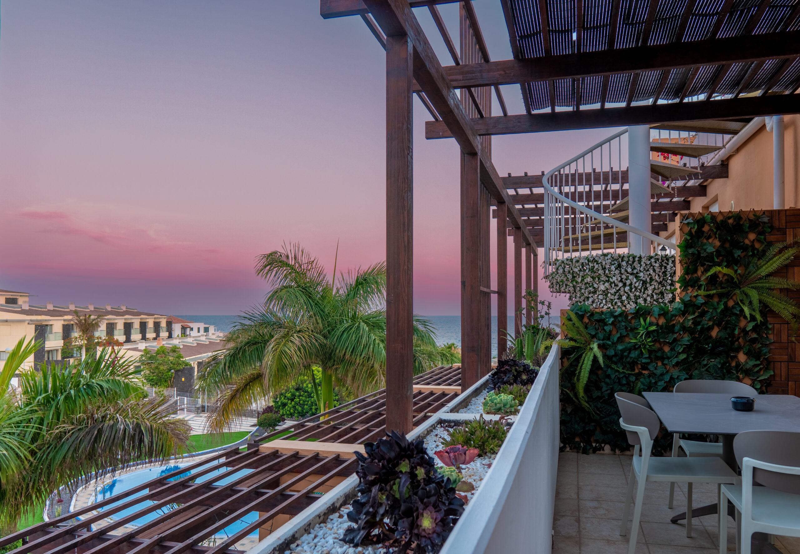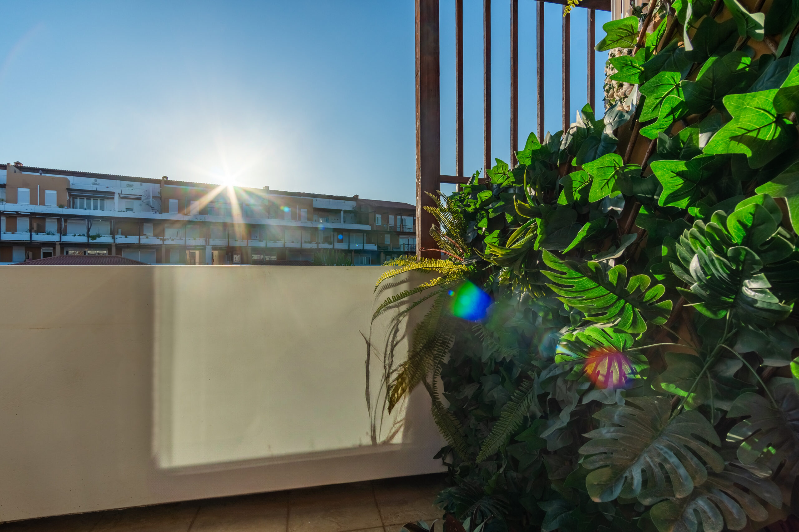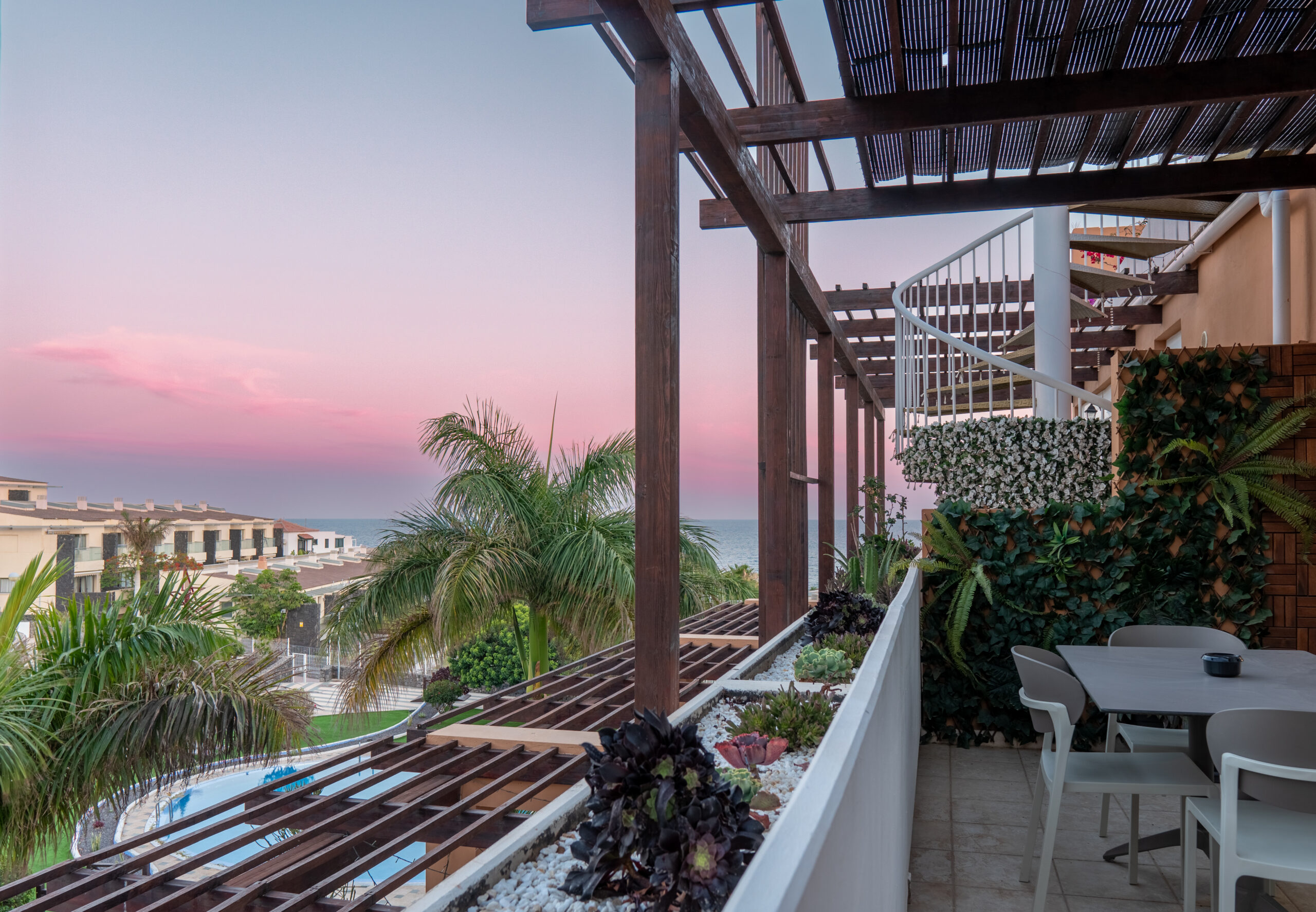 Volvemos al salón y salimos a una amplia terraza de 18 metros cuadrados donde podemos disfrutar del sol en las primeras horas del día y de la sombra asombrosa por la tarde que permite mantener la temperatura del apartamiento muy agradable sin necesidad del uso del aire acondicionado. Subimos por la escalera a caracol arriba y nos acoge una amplia terraza con vistas panoramicas de 34 metros cuadrados que sirve perfectamente como un solarium o como un espacio para reunir familia y amigas para una barbacoa.