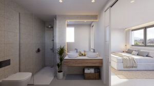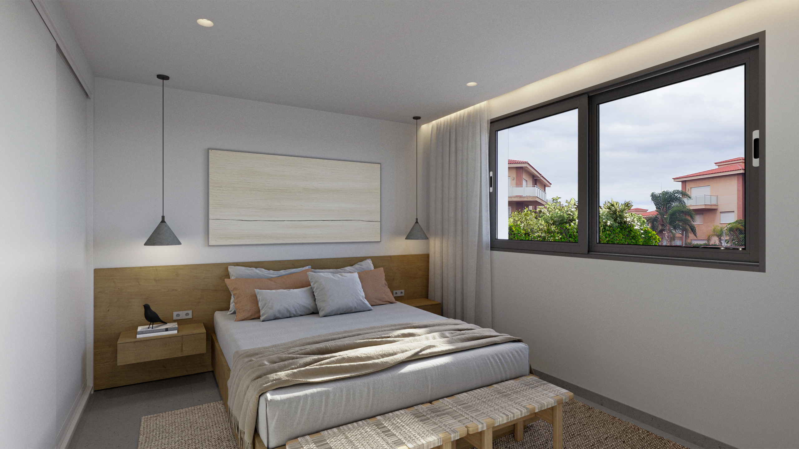 Cada apartamento cuenta con 3 dormitorios espaciosos, diseñados para proporcionar privacidad y confort, y 2 baños modernos y bien equipados. También disponen de una zona de lavandería perfectamente integrada para mayor practicidad.